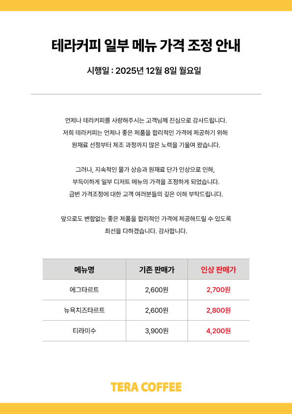 ¾ðÁ¦³ª Å×¶óÄ¿ÇǸ¦ »ç¶ûÇØÁֽô °í°´´Ô²² Áø½ÉÀ¸·Î °¨»çµå¸³´Ï´Ù. ÀúÈñ Å×¶óÄ¿ÇÇ´Â ¾ðÁ¦³ª ÁÁÀº Á¦Ç°À» ÇÕ¸®ÀûÀÎ °¡°Ý¿¡ Á¦°øÇϱâ À§ÇØ ¿øÀç·á ¼±Á¤ºÎÅÍ Á¦Á¶ °úÁ¤±îÁö ¸¹Àº ³ë·ÂÀ» ±â¿ï¿© ¿Ô½À´Ï´Ù. ±×·¯³ª, Áö¼ÓÀûÀÎ ¹°°¡ »ó½Â°ú ¿øÀç·á ´Ü°¡ ÀλóÀ¸·Î ÀÎÇØ, ºÎµæÀÌÇÏ°Ô ÀϺΠµðÀúÆ® ¸Þ´ºÀÇ °¡°ÝÀ» Á¶Á¤ÇÏ°Ô µÇ¾ú½À´Ï´Ù. ±Ý¹ø °¡°ÝÁ¶Á¤¿¡ ´ëÇÑ °í°´ ¿©·¯ºÐµéÀÇ ±íÀº ÀÌÇØ ºÎʵ右´Ï´Ù. ¾ÕÀ¸·Îµµ º¯ÇÔ¾ø´Â ÁÁÀº Á¦Ç°À» ÇÕ¸®ÀûÀÎ °¡°Ý¿¡ Á¦°øÇص帱 ¼ö ÀÖµµ·Ï ÃÖ¼±À» ´ÙÇϰڽÀ´Ï´Ù. °¨»çÇÕ´Ï´Ù.